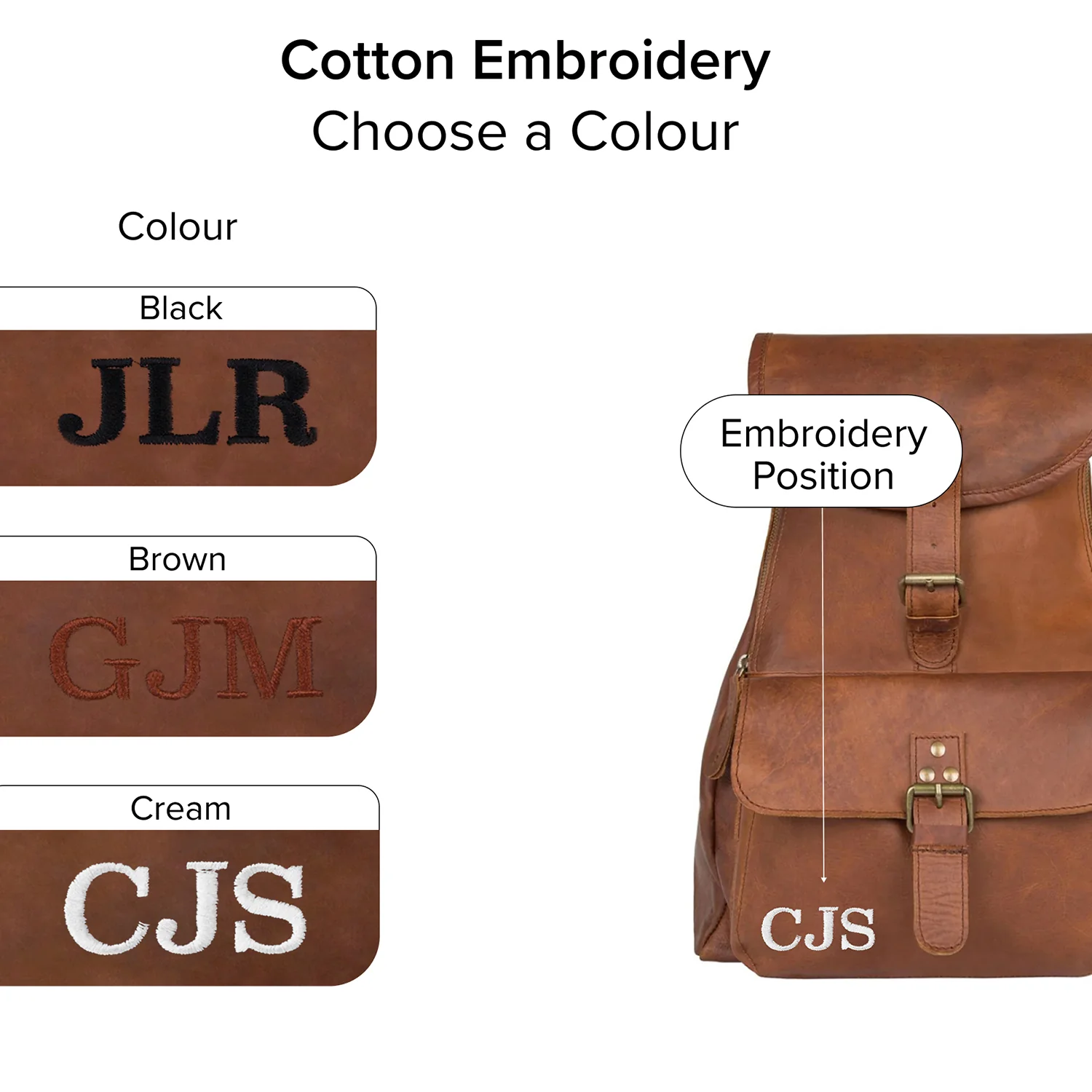 - Features: Extendable back straps, front pocket with popper fastening and buckle detailing, back zip pocket, internal zip pocket, leather flap secured with buckle over the zip closure.